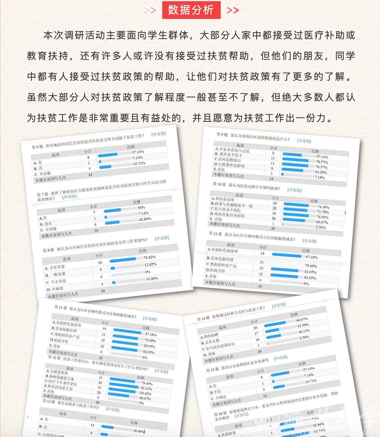 2020年8月8日,白菜全讯0008官方网第一届“益行”暑期社会实践队关于山区扶贫线上调研活动圆满完成。为引导人们关注贫困问题、关爱贫困人口、关心扶贫工作,营造“人人皆愿为”的社会扶贫氛围,弘扬“人人皆可为”的公众扶贫理念,体验“人人皆能为”的参与扶贫机制,也为了“益行”暑期实践队后续活动更好的展开,实践队线上全体成员开展了关于山区扶贫的线上调研活动,旨在通过线上调研活动,分析人们对于扶贫工作的了解程度,让更多的人关注扶贫工作,参与扶贫工作中来。