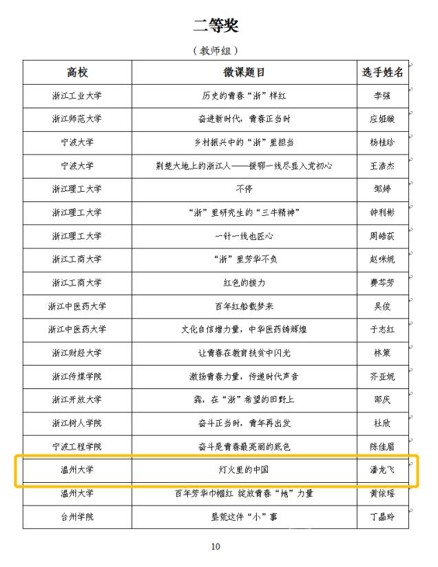 近日,由共青团浙江省委、浙江省教育厅、浙江省学生联合会主办的2020年度浙江省高校思政微课大赛获奖名单公布,白菜全讯0008官方网辅导员潘龙飞老师的思政微课作品《灯火里的中国》荣获此次微党课大赛二等奖。