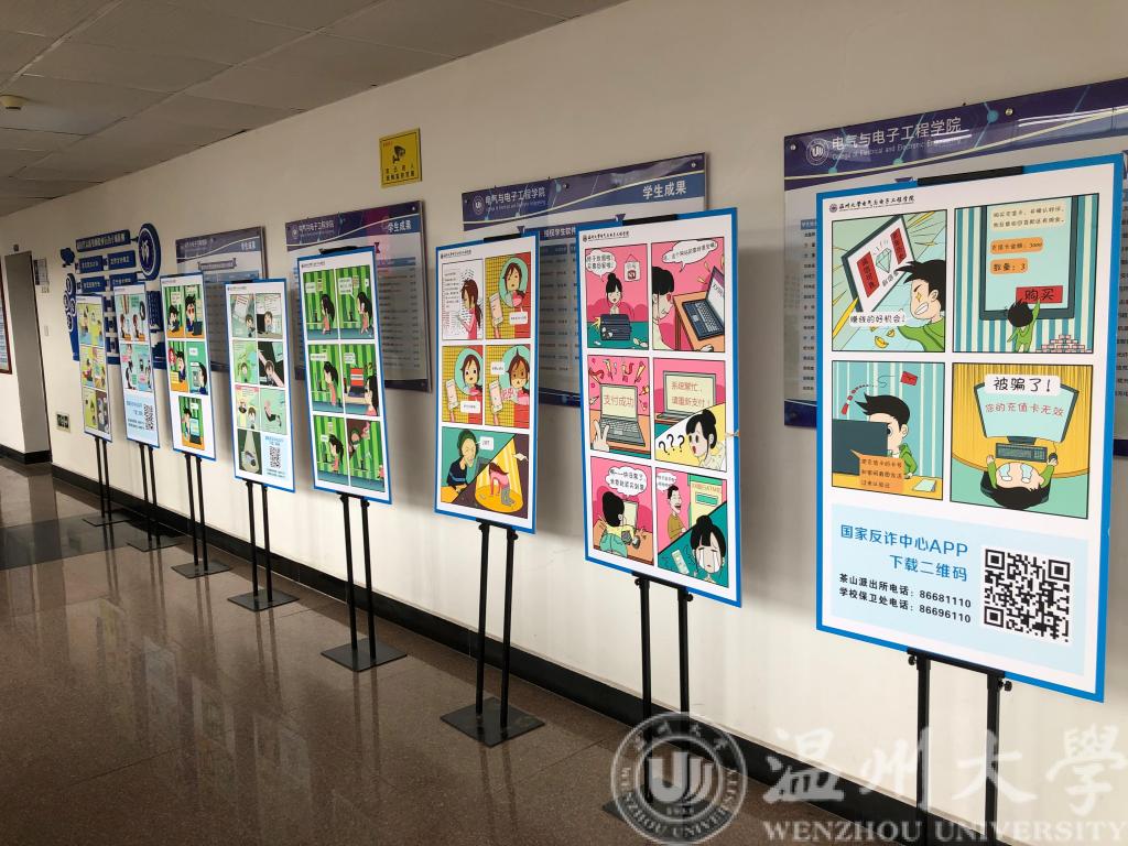为进一步构建学院师生反诈防诈新格局,学院选取了一批寓教于乐、通俗易懂的反诈宣传作品在大厅展出,通过宫格漫画的形式,方便同学们边学边get反诈新“姿势”,全方位提高防骗识诈能力。