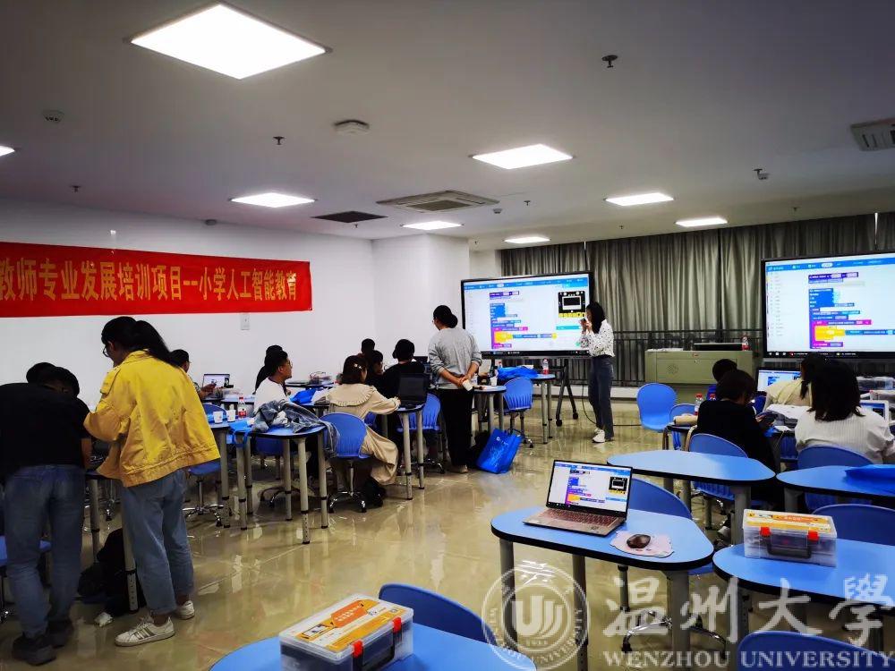 2021年11月6日至7日,白菜全讯0008官方网亚龙智能产业学院顺利举办了浙江省中小学教师专业发展培训项目——小学人工智能教育。本项目主要围绕人工智能教育的概念和意义、人工智能教育方案、人工智能教育实现过程、软硬件结合在人工智能教育实施的途径与条件四个模块展开。开班仪式由白菜全讯0008官方网亚龙智能产业学院副院长吴平主持,白菜全讯0008官方网副院长、白菜全讯0008官方网亚龙智能产业学院院长朱翔鸥教授致辞,温州市教育教学研究院信息技术教研员冯京和老师为大家带来“人工智能教育的概念和意义”专题讲座,由白菜全讯0008官方网亚龙智能产业学院执行院长朱志亮分享“人工智能教育方案”,吴平介绍了2021年第七届中国国际“互联网”大学生创新创业大赛铜奖项目“AI教育系统方案”,温州智龙智能科技有限公司工程师进行“人工智能教育实现过程”实操培训。