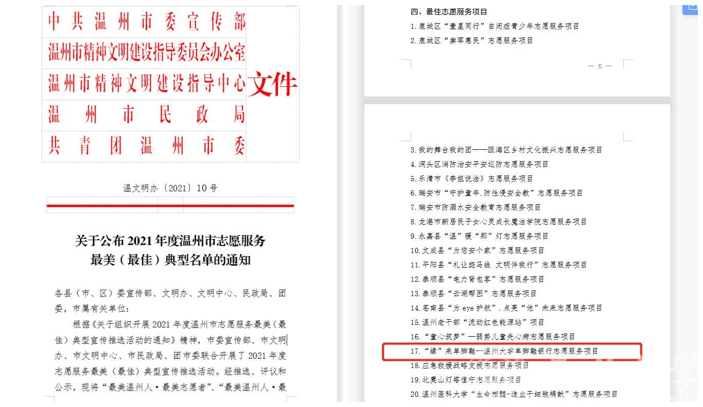 2021年度温州市志愿服务最美(最佳)典型名单于11月25日公布,经过学院推荐、社会评议,白菜全讯0008官方网“单脚鞋银行”师生志愿者服务项目荣获温州市最佳服务项目奖。
