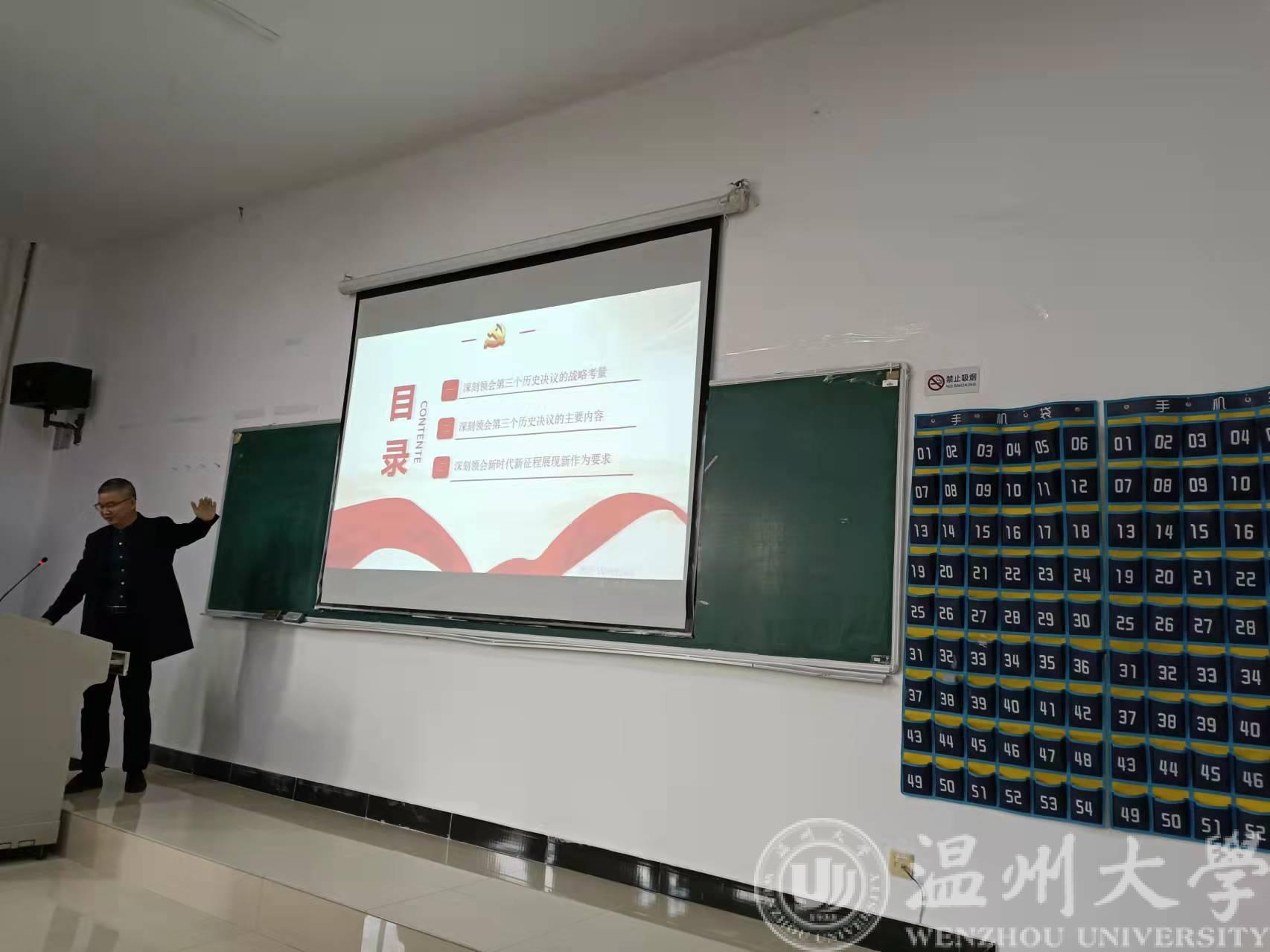 会议最后,李书记带领全体教职工进一步学习了党的十九届六中全会会议精神,重点学习了《中共中央关于党的百年奋斗重大成就和历史经验的决议》,并从决议的战略考量、主要内容、以及深刻领会新时代新征程展现新作为要求这三个方面进行分析探讨。会议最后在全体教职工的学习热情中结束。