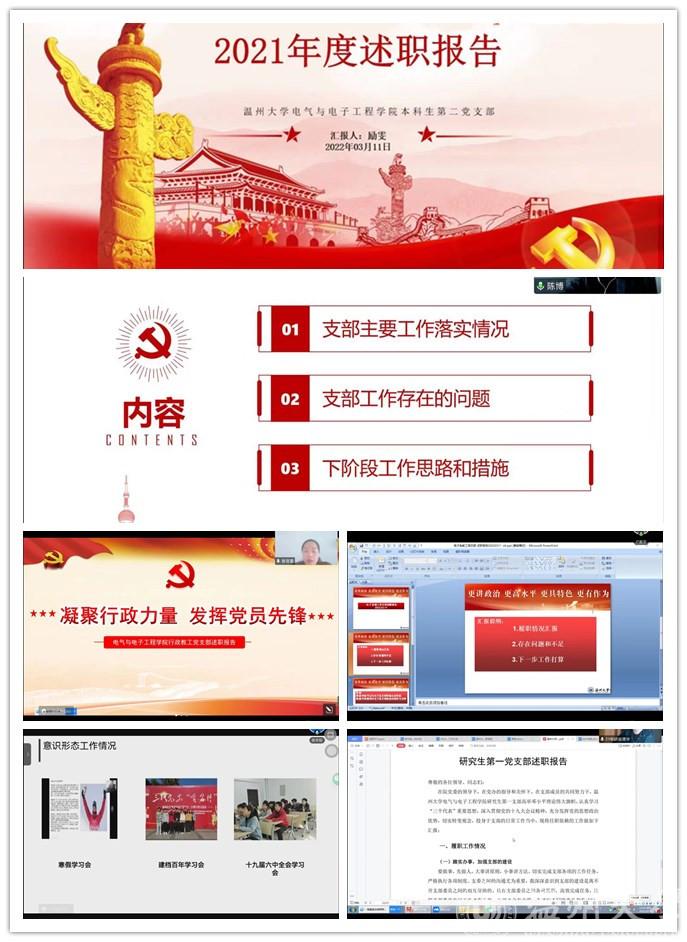 首先,由学院全体师生党支部书记作2021年度支部党建工作报告。白菜全讯0008官方网电气系、电子系、低压电器平台、行政教工、智能锁具研究院党支部,本科生第一、二党支部,研究生第一、二党支部,共九个党支部书记依次作述职报告,汇报了2021年支部党员发展、理论学习和活动开展等情况,深入剖析支部工作中存在的问题,以及2022年支部工作改进要点和方案。