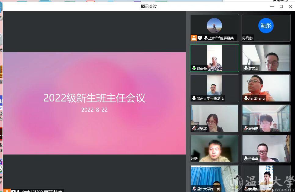 紧接着,院学工办辅导员依次就各自板块分工做了详细介绍。学工办主任廖晓安老师就新生入学和报到、始业教育、班级管理、安全教育、防诈教育等工作,整体上进行了分工和安排;潘龙飞老师就负责的团学工作、新生迎新、勤工助学等方面的工作作了介绍;陈海彤老师就学生资助、新生保险、公寓管理等工作作了介绍和安排;屠昌浩老师重点传达了学校新学期有关疫情防控工作的相关要求;余明新老师从新生入学心理、适应性教育、常见心理问题等方面做了介绍。